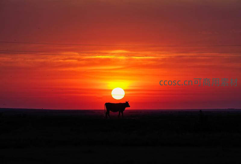 一轮红日沉入地平线,将天空染成绚烂橙红,一头牛的黑色剪影静静伫立在广袤草原上,构成一幅诗意而宁静的画面。
