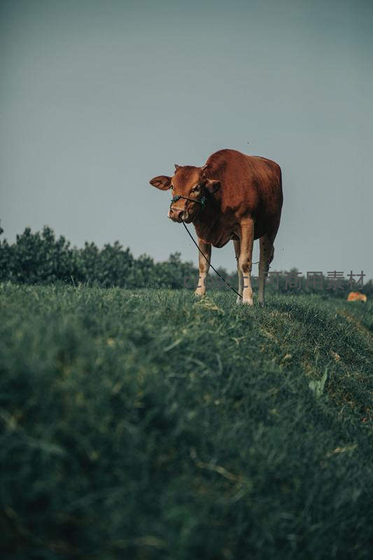 棕牛静立青翠草地远眺天际