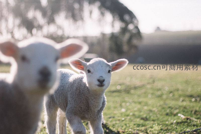 阳光透过树叶洒在草地上,两只毛茸茸的小羊羔正好奇地靠近镜头,其中一只清晰可见,另一只虚化在前景,充满了童真与活力。