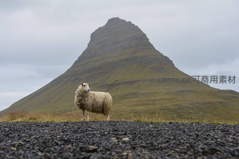 一只绵羊独自站在布满黑色火山岩的路面上,身后是雄伟陡峭、植被覆盖的锥形山峰,阴云密布的天空更显其孤寂与壮美。