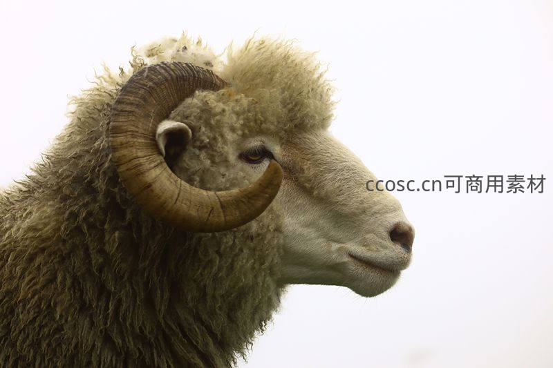 一只成年公羊的侧面肖像,巨大的螺旋角与浓密羊毛形成鲜明对比,眼神平静而深邃,背景纯净突出主体。