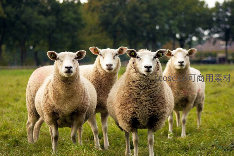 四只绵羊并肩凝视镜头,草地绿意盎然