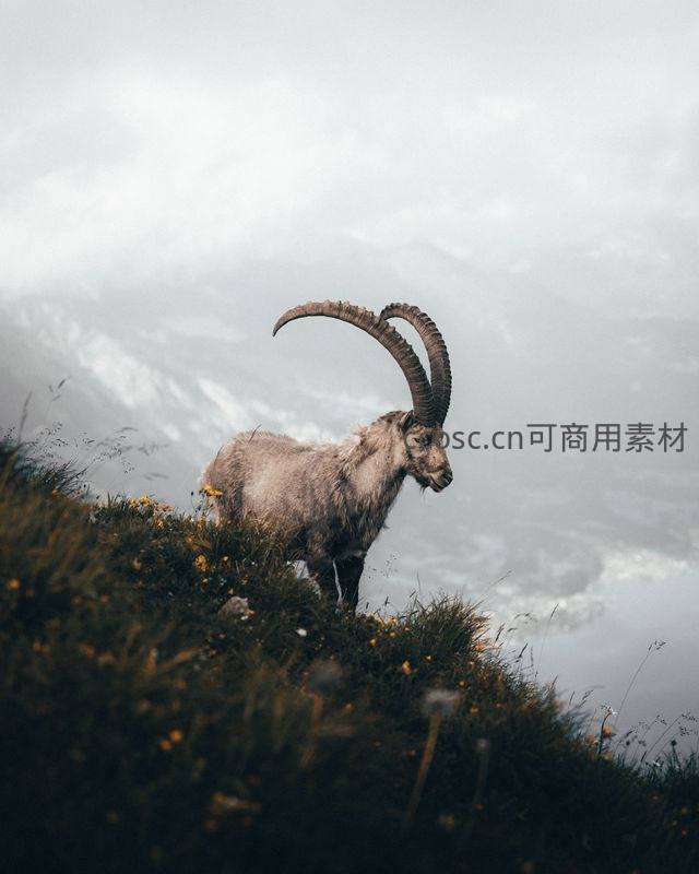 一只拥有巨大螺旋角的盘羊独自伫立在云雾缭绕的山巅草坡上,其粗犷的外形与朦胧的背景形成强烈对比,彰显出野性生命的坚韧与孤傲。