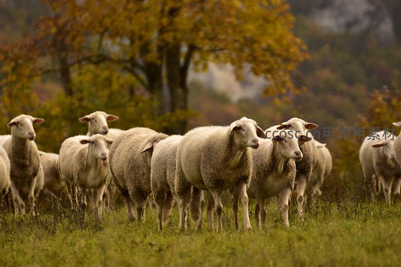 一群绵羊在秋日的山坡草地上悠闲地行走,背景是黄绿相间的树林,画面宁静而充满田园诗意。