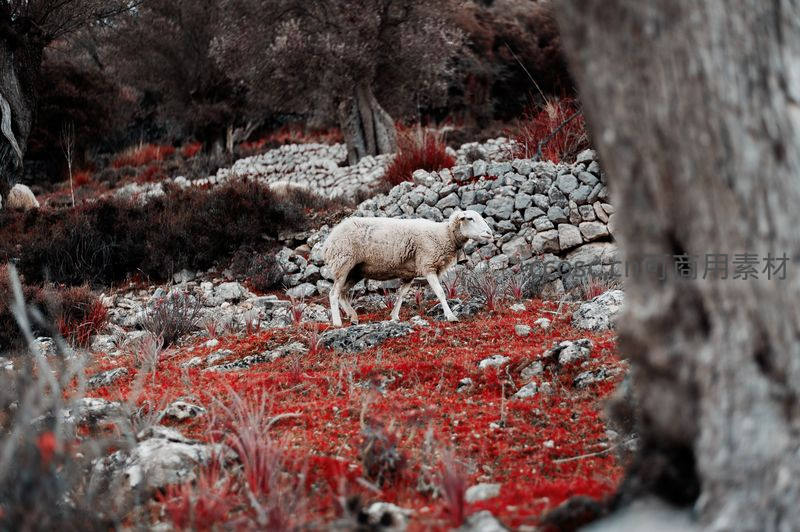 一只白色绵羊独自行走在铺满鲜红色植被和灰色石块的小径上,周围是枯树和灌木,构图独特,营造出一种奇幻而静谧的秋日山林氛围。