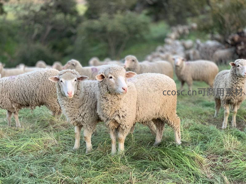 镜头聚焦于一群毛茸茸的绵羊,它们在收割后的草地上亲密地站在一起,好奇地望向镜头,背景是模糊的树林,充满宁静与温馨。