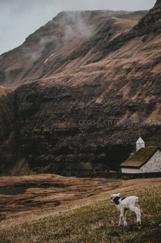 一只黑白相间的小羊羔独自站在枯黄的草地上,身后是陡峭的褐色山崖和一座掩映在山脚下的古老石屋,画面充满故事感与地理特色。