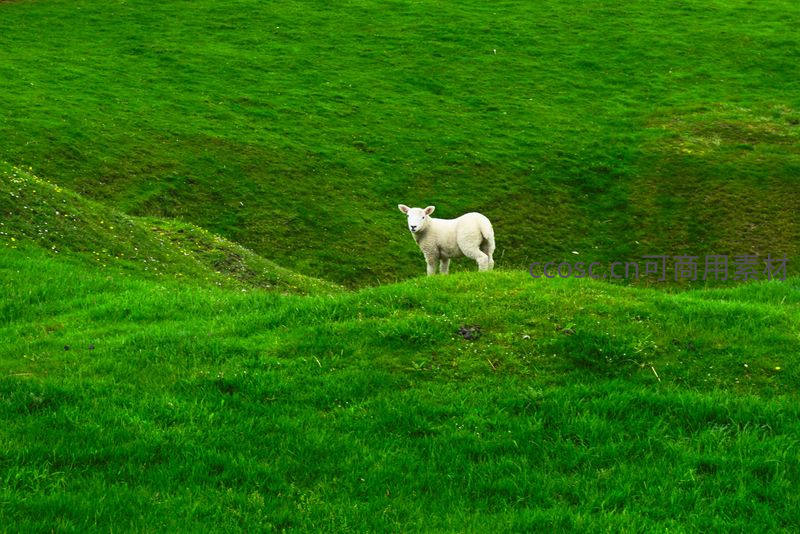 一只洁白的小羊独自站在起伏的绿色山坡上,背景是连绵的草地,画面宁静开阔,展现了大自然中生命的纯真与辽阔。