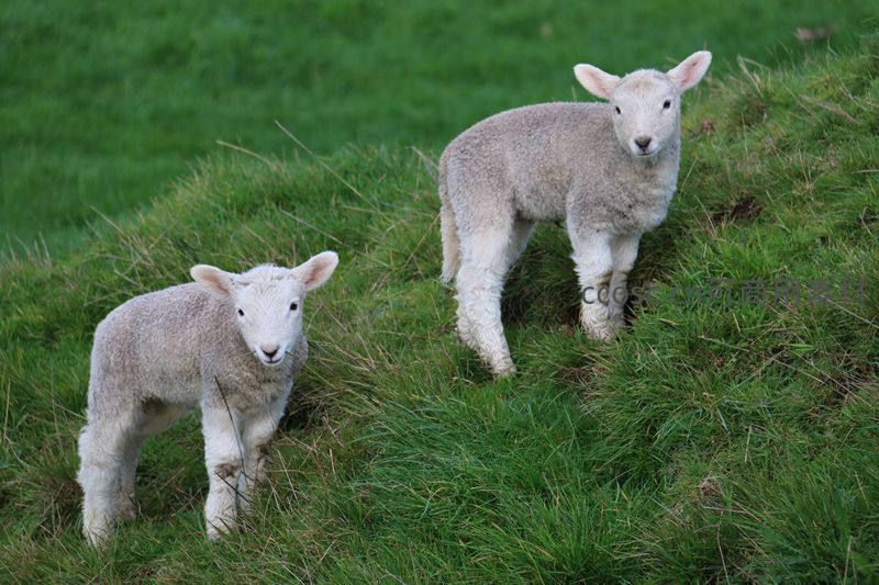 两只毛茸茸的小羊羔站在斜坡草地上,一前一后,睁着大眼睛好奇地望向镜头,显得天真无邪,充满生机与童趣。