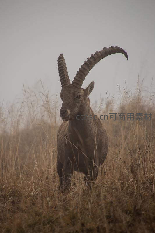 一只雄壮的岩羊在薄雾笼罩的枯黄草丛中凝视镜头,其标志性的巨大螺旋角在柔和的光线下显得格外威严,完美捕捉了高山野生动物的原始力量与神秘感。