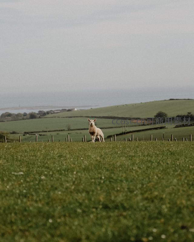 孤羊伫立翠绿田野,远眺朦胧海景如画