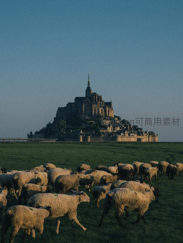 圣米歇尔山下羊群奔腾,暮色古堡如画