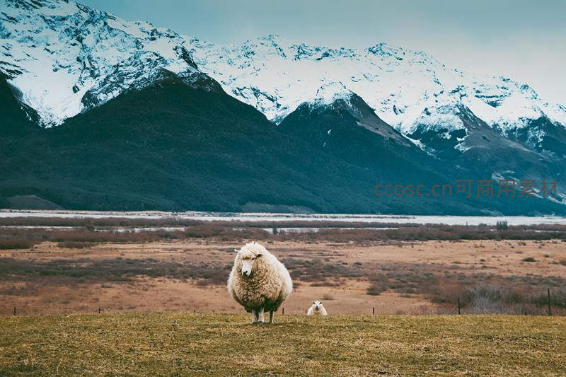 雪山脚下孤羊伫立,辽阔草原尽显苍茫