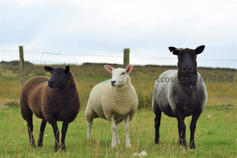 三只不同颜色绵羊田野中对视