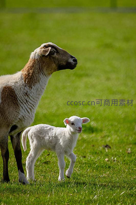 纯白如雪的小羊羔紧随其后,依偎在成年母羊身边,在青翠的草地上迈出稚嫩的步伐,尽显温馨可爱的亲子时光。