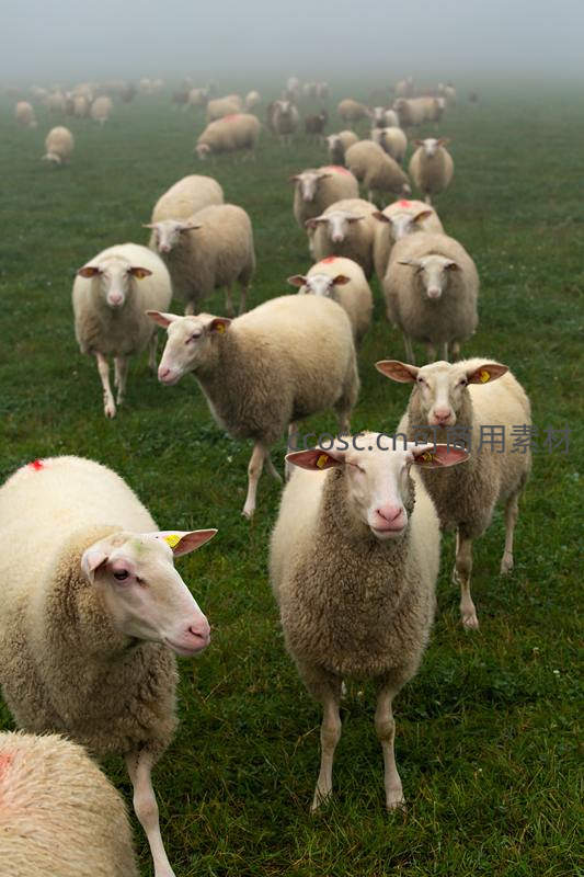 雾中羊群漫步绿野,宁静田园风光
