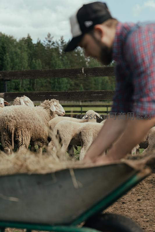 戴着帽子的农场主正弯腰从手推车里取草料,准备喂食围栏内的羊群,展现了人与动物之间朴实而温暖的日常劳作场景。