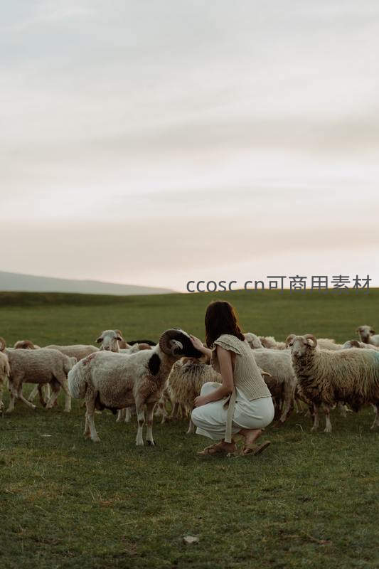 一位女子蹲在广袤的草原上,温柔地抚摸着一只公羊,周围是成群的绵羊,背景是柔和的暮色天空,画面充满宁静与和谐。