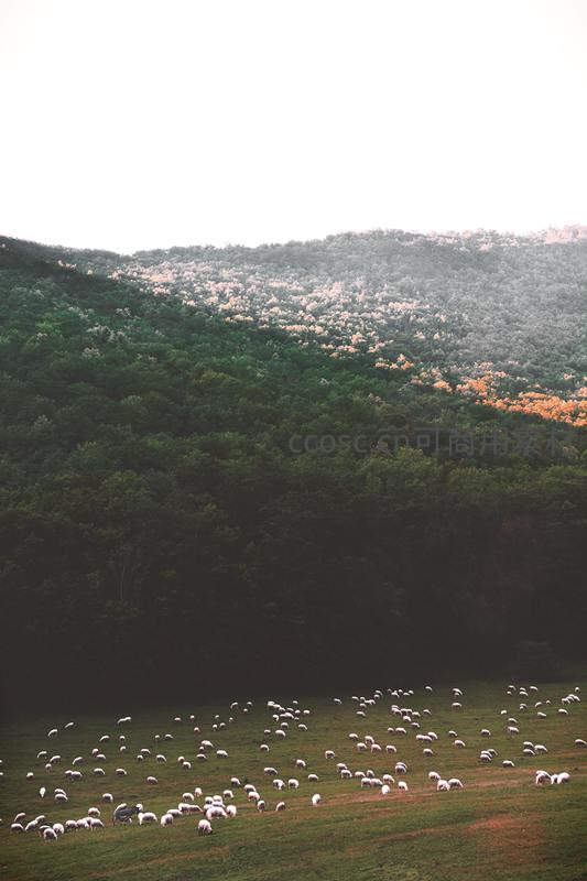 从高处俯瞰,大片羊群如白色星点散落在山脚下的草地上,背后是茂密的深绿森林和层叠山峦,展现了人与自然和谐共生的牧场景象。