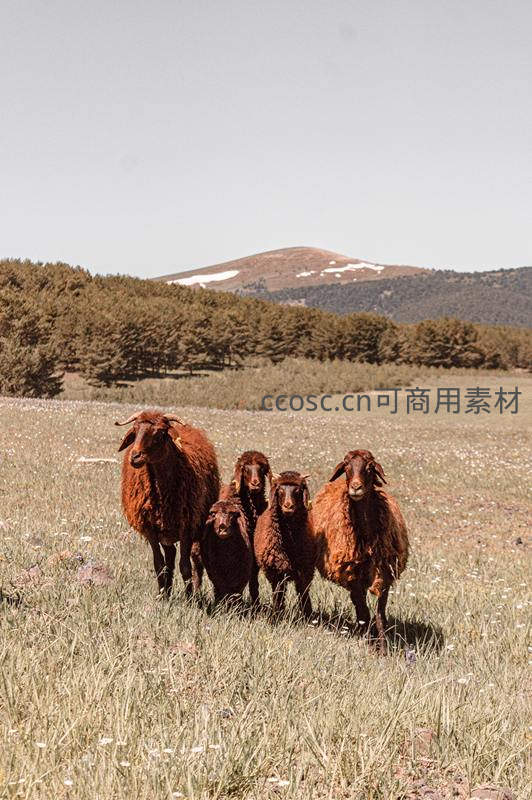 一群毛色棕红的绵羊在开阔的草地上行走,背景是连绵起伏的森林和山顶残雪,天空晴朗,充满野性与自由的气息。