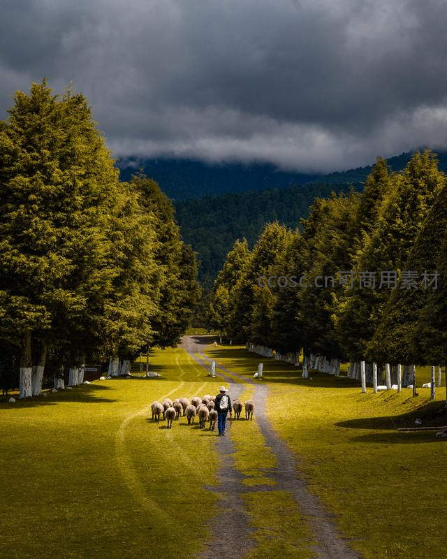 一位牧羊人正带领着一群绵羊,沿着两旁绿树成荫的土路缓缓前行,远处山峦叠嶂,天空乌云密布,构成一幅宁静而壮丽的田园画卷。