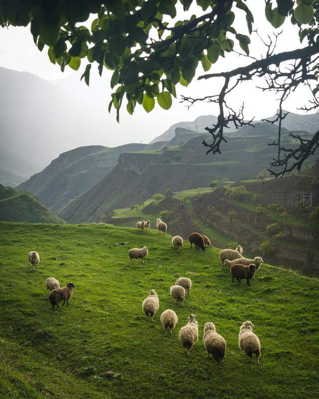 层层叠叠的绿色梯田上,羊群悠然漫步,前景树枝垂落,远山云雾缭绕,构成一幅和谐静谧的山水牧歌。