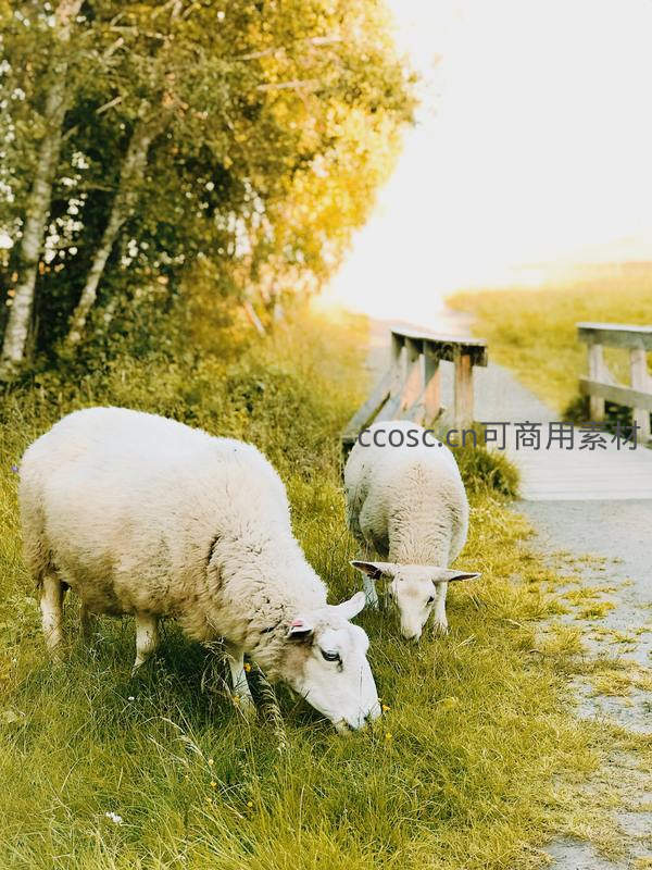 两只洁白的绵羊在绿意盎然的草地上低头吃草,背景是温暖阳光下的树林与木制小径,画面充满田园诗意与宁静氛围。