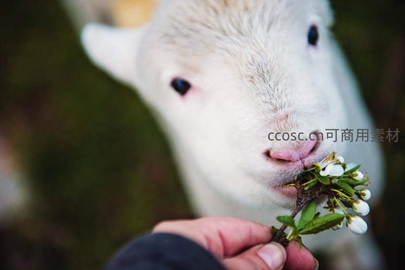 一只手轻轻托着带花的树枝,小羊凑近温柔啃食,眼神专注而温顺,展现了人与自然和谐相处的美好瞬间。