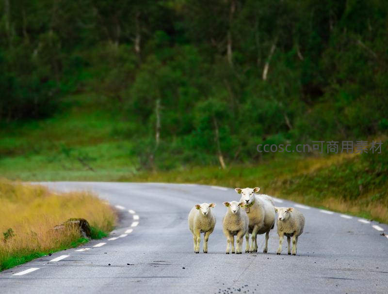 四只洁白的绵羊在蜿蜒的乡间公路上悠闲漫步,背景是郁郁葱葱的森林和青翠草地,画面充满田园诗意与宁静氛围。