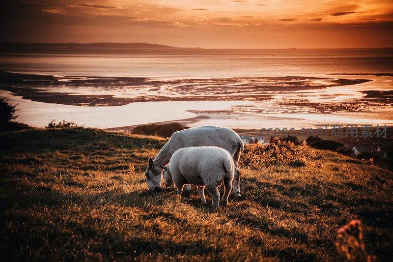 夕阳下海岸边的绵羊剪影