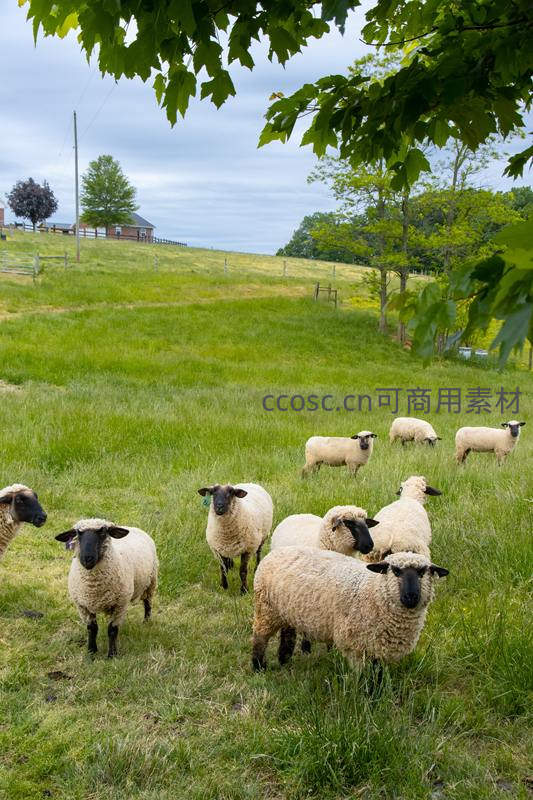 一群黑白相间的绵羊散布在翠绿的山坡牧场上,有的低头吃草,有的好奇张望,树叶从画面上方垂下,构成一幅生机勃勃的田园牧歌图。