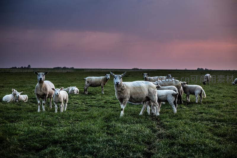 一群绵羊和小羊羔在广阔草地上悠闲活动,紫红色晚霞映衬着宁静牧场,展现人与自然和谐共处的美好画面。