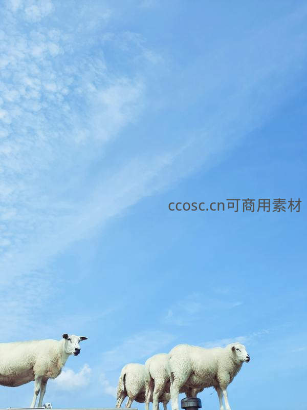 几只洁白的羊儿在湛蓝天空下静静站立,云朵轻盈飘逸,画面纯净空灵,带来视觉上的宁静与心灵的放松。