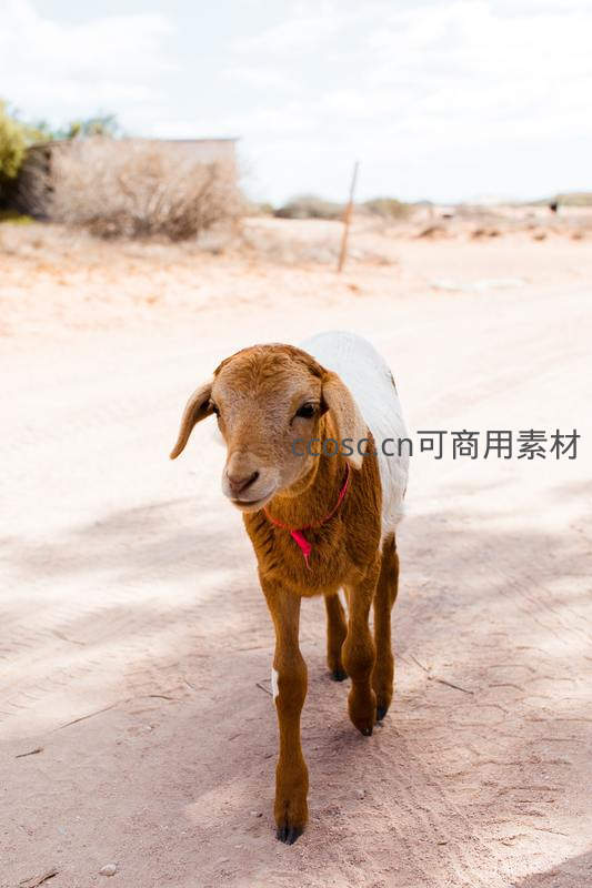 一只棕白相间的小羊羔戴着红色项圈,在干燥的沙土地上缓缓走来,背景是稀疏灌木和简陋建筑,充满田园气息。