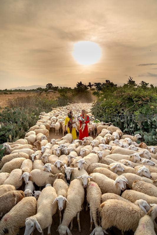 夕阳下牧羊女引领庞大羊群穿越田野