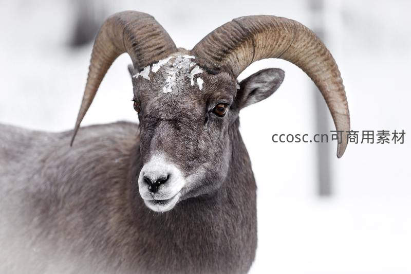 盘羊正对镜头,额头上点缀着雪花,双角弯曲有力,眼神沉静而警觉,展现了高山动物在严寒中的生存之美。
