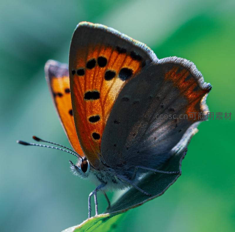 橙黑斑点蝴蝶栖息绿叶特写