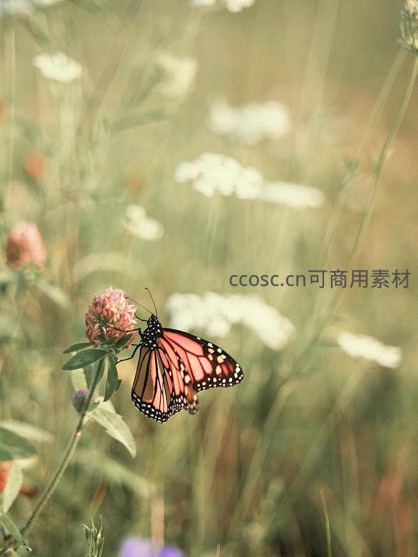 一只色彩鲜艳的橙黑色斑蝶停驻在粉红色花苞上,背景是朦胧的绿色草甸,展现了大自然中昆虫与植物和谐共生的美好瞬间。
