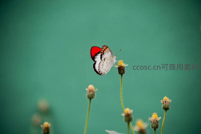 一只翅膀边缘带鲜红点缀的白色蝴蝶正优雅地吸食花蜜,纯净的绿色背景衬托出其灵动身姿,画面充满生机与自然美感。
