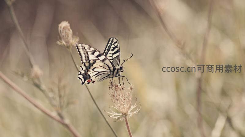 一只黑白条纹分明的凤蝶停在干枯的草茎顶端,背景是朦胧的荒野色调,营造出一种复古怀旧的氛围,展现了自然界中生命的坚韧与优雅。