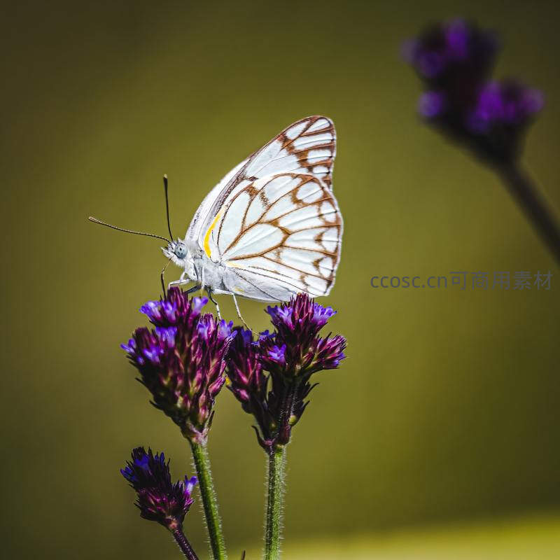 一只洁白翅膀带棕色网状纹路的蝴蝶轻盈地停在深紫色的马鞭草花穗上,背景为柔和的橄榄绿,画面纯净而富有诗意,凸显自然生态的细腻之美。