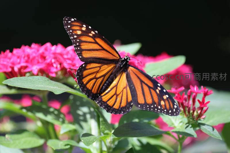 帝王蝶飞舞粉花背景前