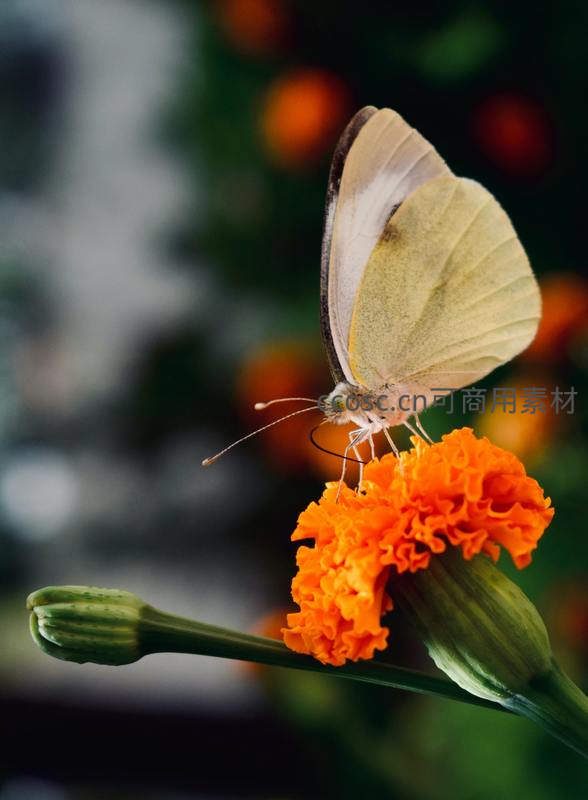 一只翅膀呈淡黄色的粉蝶,正用细长的口器汲取着一簇橙红色万寿菊的花蜜,背景虚化处理,营造出宁静而专注的采蜜瞬间,充满生机。