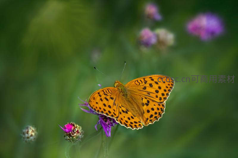 橙斑蝶栖紫花,绿野微距显生机