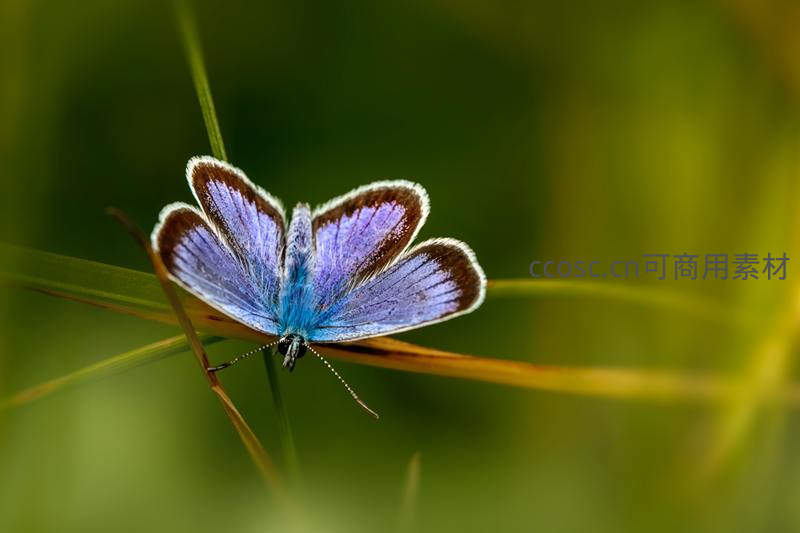一只通体蓝色、边缘镶白的蝴蝶栖息在草叶上,柔和光线使其翅膀泛起梦幻光泽,背景虚化突出主体,展现微观世界的美丽。