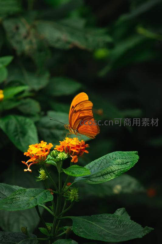 一只鲜艳的橙色蝴蝶停驻在盛开的橙黄色小花上,背景是深邃的绿色叶片,展现出自然生态的和谐与生机。