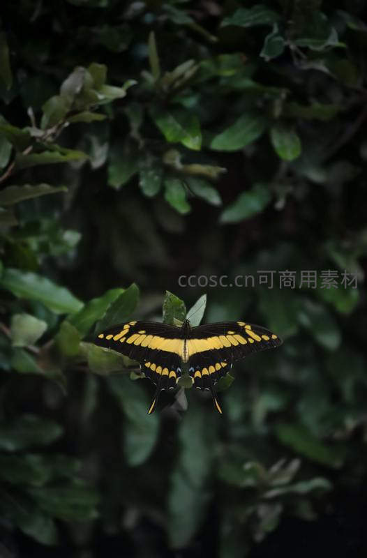 黄黑凤蝶展翅于深绿叶丛间