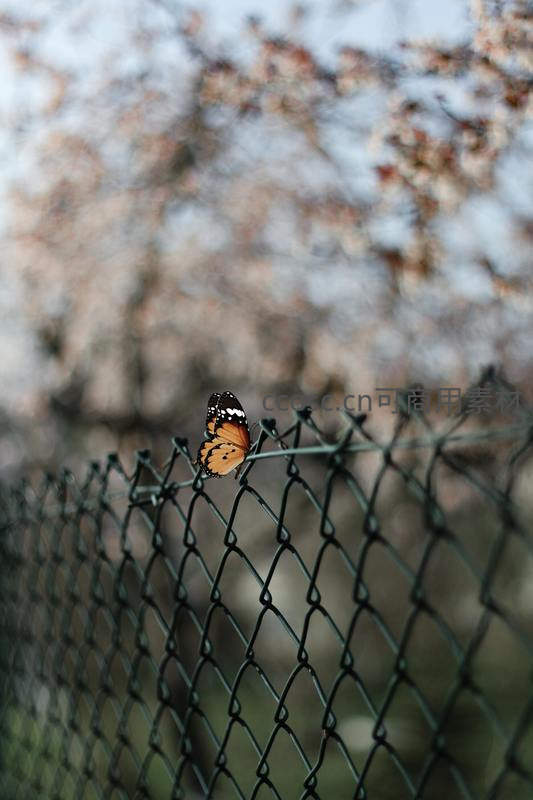 橙黑斑蝶栖息铁丝网,背景花树朦胧