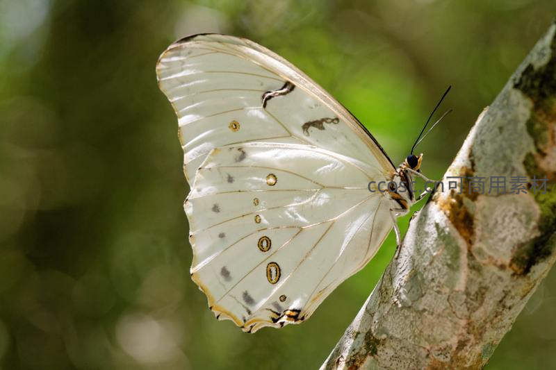 一只通体洁白、带有金色眼斑的蝴蝶优雅地停留在粗糙树皮上,阳光透过树叶洒下斑驳光影,展现大自然的细腻与生机。
