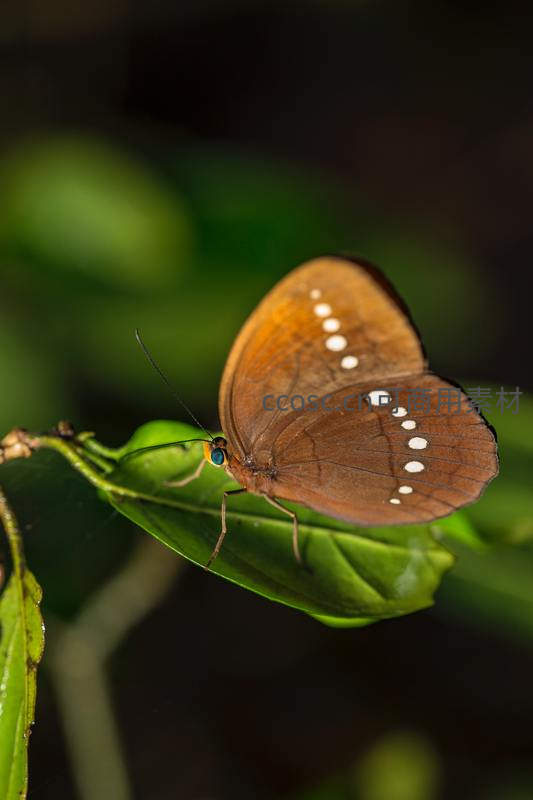 一只棕色蝴蝶安静地停在鲜绿叶片上,翅膀上排列整齐的白色圆点如星辰般闪耀,暗色背景更凸显其温婉与自然的诗意。